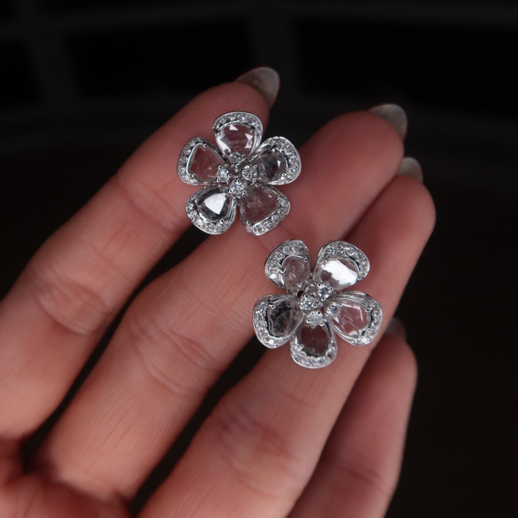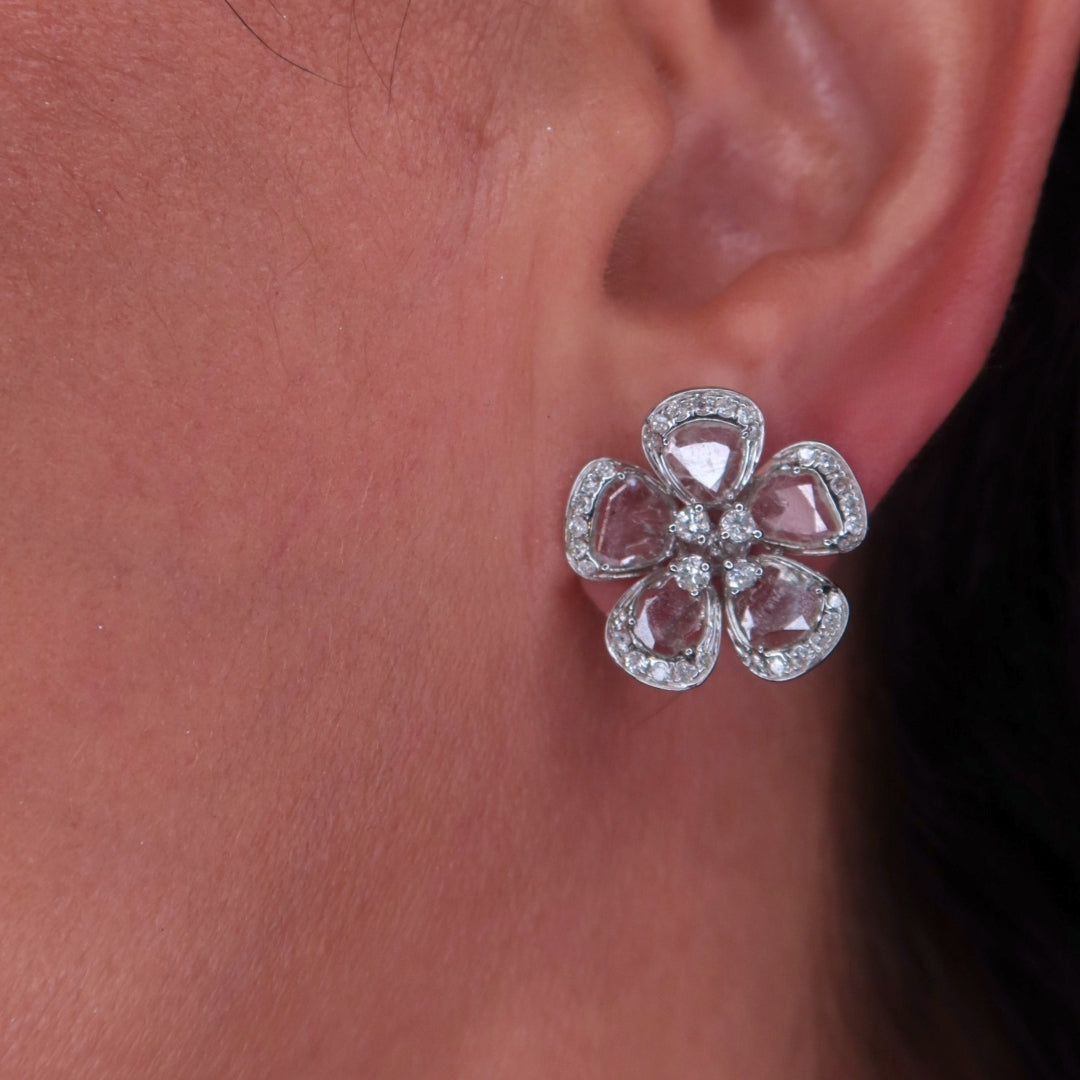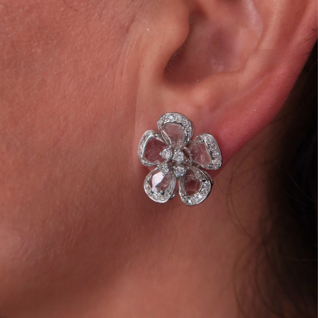 The Fiona Blanc Earrings are timeless yet distinctive, featuring white slice diamonds framed by round brilliant diamonds in 18K white gold. Designed for versatility, these elegant studs strike the perfect balance between everyday wear and refined sophistication. The organic beauty of the slice diamonds, combined with the radiant brilliance of the round diamonds, makes them a standout addition to any collection.