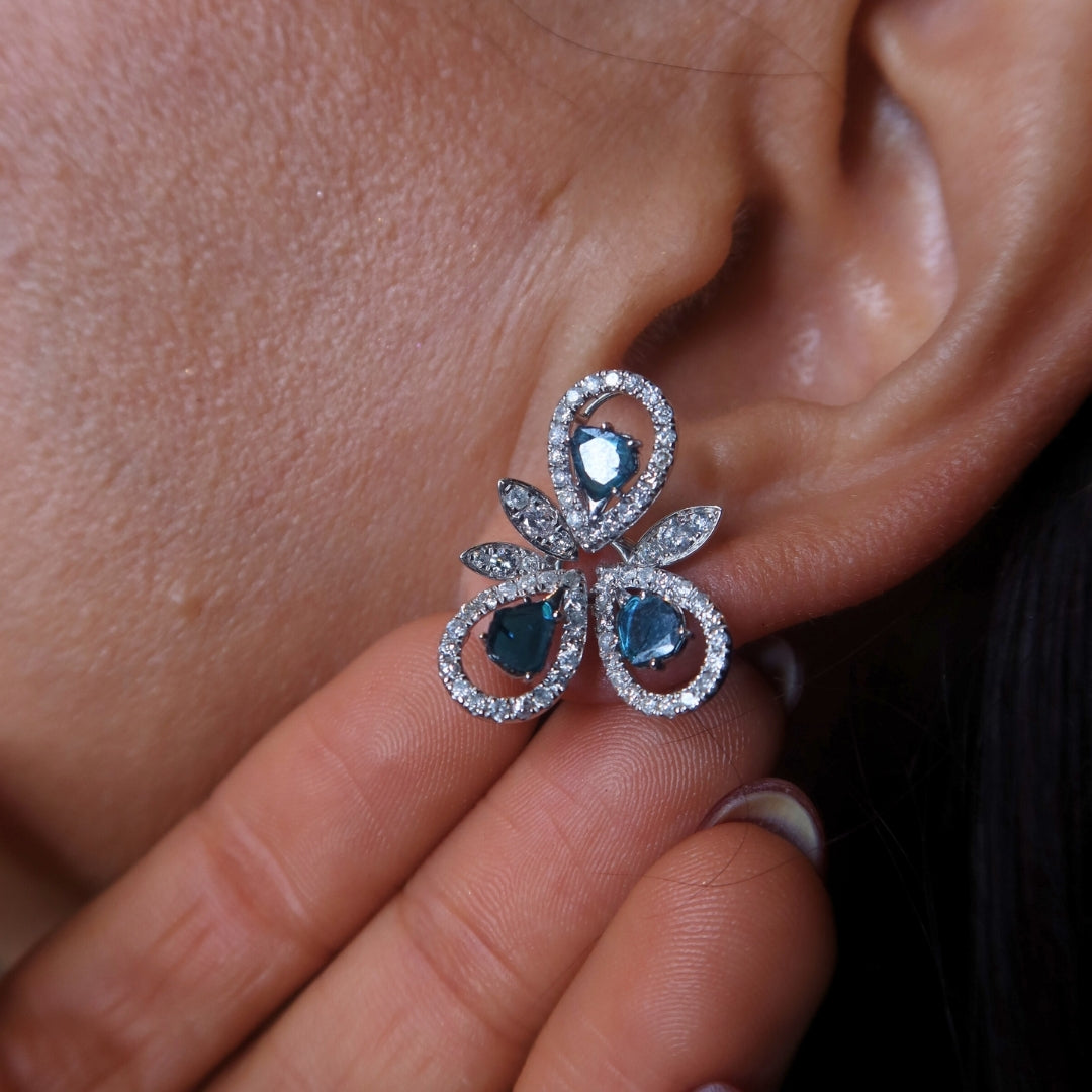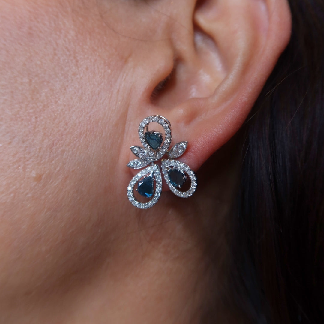 Its love at first sight with these adorable Khaia Studs. Charmingly designed, the white gold trillium motif is studded with round diamonds and each petal is punctuated with blue sliced sapphires.